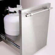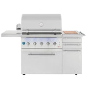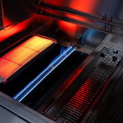 The 36-inch Encore also features a unique Flame Thrower Ignition that shoots a burst of flame to ignite the main burners and is much more reliable than traditional spark ignition systems. The double lined, spring assisted hood keeps hot air in to ensure a consistent grilling environment complete with a built in 3-inch temperature gauge and interior halogen lighting with LED front panel lighting. Available for both propane and natural gas, this built in grill ensures a complete outdoor kitchen.