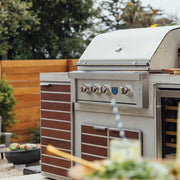 The 42-inch Estate also features a signature Flame Thrower Ignition that shoots a burst of flame to ignite the main burners and is much more reliable than traditional spark ignition systems. The double lined, spring assisted hood keeps hot air in to ensure a consistent grilling environment complete with a built in 3-inch temperature gauge and interior halogen lighting with LED front panel lighting. In addition, the 15,000 BTU infrared back burner offers a high quality rotisserie burner for professional style rotisserie cooking and includes a storage bracket for the rotisserie spit when not in use. Available for both propane and natural gas, this built in grill ensures a complete outdoor kitchen.