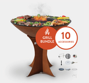 The Arteflame Classic Euro 30" Portable Charcoal Grill and Fire Bowl is a one of a kind grilling experience. The cooktop is made of extra thick carbon steel and the spun bowl is high grade US CORTEN steel or "weathering" steel. The base is crafted of CORTEN steel components that sit on a stainless steel footer. The base fits together easily without using any tools. The Arteflame is designed with "Classic" lines and unsurpassed functionality.
