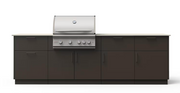 The Urban Bonfire Cabinetry offers unmatched storage solutions to keep your outdoor kitchen organized. Its marine-grade aluminum construction and Architectural Bronze NACRAE™ finish are designed to endure the elements while maintaining a refined look. Storage highlights include three top drawers for utensils and tools, a pull-out trash/recycling drawer with included bins, two single cabinets for additional storage, and a double-door under-grill cabinet for grilling essentials. Removable panels provide easy access to plumbing and electrical connections, making installation and maintenance hassle-free.