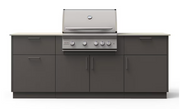 Model B-SNRS32-GUN-AERIS-MG Size 8 Ft Overall Dimensions 89.5" W x 36.5" H x 29.75" D Exterior Material Marine-Grade Aluminum Finish Gunmetal NACRAE Countertop Material Aeris Premium Dekton Countertop Color Tan (Aeris) Grill Type Blaze Marine Grade LTE+ 32-Inch 4 Burner Grill Grill Exterior Material Type 316L Stainless Steel Cooking Area 715 sq. in. (24 burgers) Burners Four (4) cast stainless steel burners, 14,000 BTUs each Rotisserie Burner 10,000 BTUs Ignition System Push-and-turn flame-thrower ignition Grill Lights Halogen interior lights and LED-illuminated control knobs Storage 2 Top Drawers, Pull-Out Trash/Recycling Drawer, Single-Door Cabinet, Double-Door Under-Grill Cabinet Electrical Requirements (Grill) 120V, 15-amp circuit, GFCI-protected outlet Weight 570 lbs.