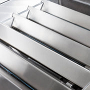 This grill features a commercial-quality cart to facilitate easy movement--great for venues like gold courses and large banquets! Two large eight-inch rubber-coated all-terrain wheels allow for efficient movement on any surface, while commercial-grade locking casters keep grill stable during use. Durable stainless steel shelves and a propane tank bracket (if applicable) round out an impressive feature set for this unit.