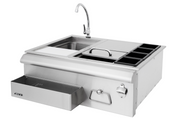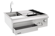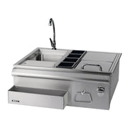 Bull BG-97623 Slide-In Bar Center with Sink, 30x28.375-Inches provides a highly functional outdoor kitchen accessory that's sure to enhance any cooking space. The 30-inch bar caddy is constructed from 16-gauge 304 stainless steel for durability and longevity in the elements. This unit comes complete with a water faucet, cutting board, removable condiment tray, ice chest with removable lid, and a bottle opener to satisfy the dedicated grill master. The bar center is sure to enhance any Bull BBQ island and make your grilling experience easier and more efficient.