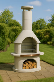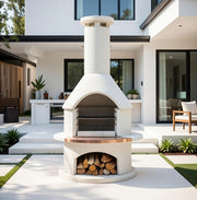 The Buschbeck Rondo BBQ and Grill is an achievement in both looks and functionality. The Rondo has a more rounded design and is finished in white quartz with a copper insert in the mantlepiece and a flat chimney cap.