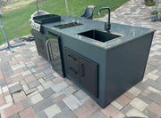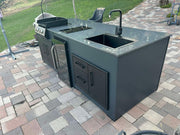 Medium Rare is an extended version of the Rare model, which, in addition to the professional gas grill and the built-in gas hob, offers a much larger work surface, a stainless steel sink, and a showcase drink cooler for a more complete outdoor kitchen experience. The product is based on a powder-coated 100% aluminum structure which can be easily assembled by the customer. It is equipped with high quality 304 stainless-steel doors and elements. Weather-proof thermo-wood shelves, legs and side wings ensure smooth and enjoyable grilling in all conditions. And the UV, frost and stain resistant polished granite countertop adds stability and elegance to this beautiful model.