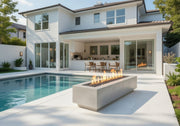 Natural Grey Contemporary Concrete Finish and 7” X 57” Crystal Fire® Plus Burner Insert inside 12” X 64” plate. Matching Supercast™ pedestal included.