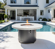 The Beacon Gas Fire Pit Table Collection redefines timeless elegance with a contemporary twist. Featuring a striking White Onyx Supercast™ top, this fire pit table is paired with a durable, graphite-gray, powder-coated steel base that’s designed to last. Its chat-height design is perfect for creating a cozy and inviting space for guests to gather, relax, and enjoy the warmth of the fire.