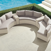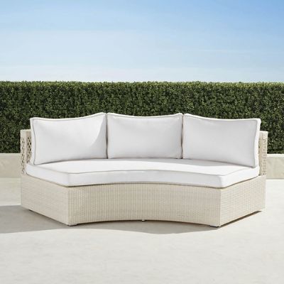 Create the ultimate open-air chatroom with our comfortably cushioned, curved outdoor sofas and matching end tables. All-weather, UV-resistant wicker is handwoven over a powder coated aluminum frame for longevity and durability, so each piece will look great, season after season. The curved design and modular functionality allow for custom arrangements. Included Sunbrella® sofa cushions have mesh bottoms for quick-drying convenience.