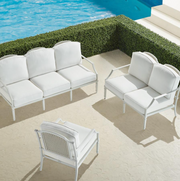 Featuring woven all-weather wicker panels inset into the seatbacks that were inspired by antique garden furniture, Whittaker brings timeless style to any outdoor space. Aluminum frame is finished with a durable powdercoated finish that protects against the elements. Included cushions are upholstered in 100% solution-dyed acrylic fabric.