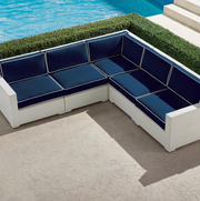 Outstanding comfort, structural integrity, and modular versatility make our Palermo Modular Seating Collection a welcome addition outdoors. White fibers are smoothly double woven around concealed powder coated aluminum frames. Gently angled backs and wide arms encourage restful lounging. The industry's best high-performing fabrics encase the thick, double-wrapped foam cushions. A variety of accent tables keep drinks within reach.