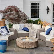 Create the ultimate open-air chatroom with our comfortably cushioned, curved outdoor sofa and matching end tables, now with a smaller profile back. All-weather, UV-resistant wicker is handwoven over a powdercoated aluminum frame for longevity and durability, so it will look great while providing plenty of comfort, season after season. The curved design and modular functionality allow for custom arrangements. Included Sunbrella® sofa cushions have mesh bottoms for quick-drying convenience.