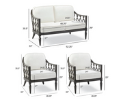 The quatrefoil motif recurring throughout our Avery Loveseat Set puts a contemporary twist on the age-old iron gates of Europe. Expertly crafted of cast aluminum with hand-filed welds, powdercoated finish and weather-defying solution-dyed acrylic cushions, this set is built to stand the test of time and mix well with pieces from our other collections. Set includes loveseat and two lounge chairs.