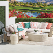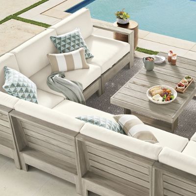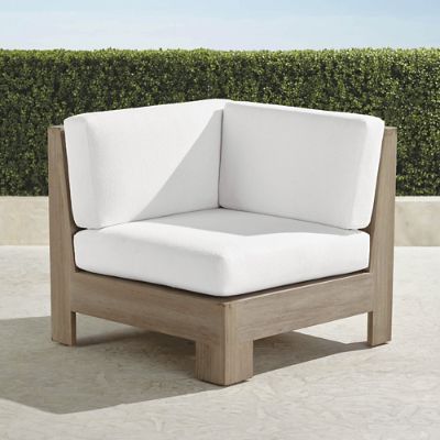 Wide-plank geometric angles and clean lines mark the captivating St. Kitts Modular Seating. Fashioned in teak with broad sturdy arms, the wood is given a satin-smooth weathered gray finish and paired with cushions.