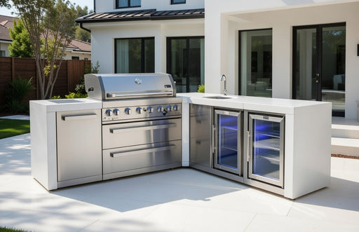 View full detailsMont Alpi 805 Deluxe BBQ Grill Island with 90 Degree Corner, Kegerator, Beverage Center & Fridge Cabinet - MAi805-D90KEGBEVFC