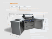 Elevate your outdoor cooking with the Mont Alpi 4-burner Deluxe Island with 45-degree corners. The MAi400-D45 boasts four burners, an infrared side burner, and an infrared rear burner for a rotisserie experience. The 45-degree corner modules add extra prep area, making it perfect for tighter patios with corners. The grill is made of 304 Stainless Steel components and includes a rotisserie kit, full-size weather cover, and a granite matching chopping board. With LED knob lights, bright internal cooking lights, and white granite surfaces, this grill provides perfect vision and precision control.