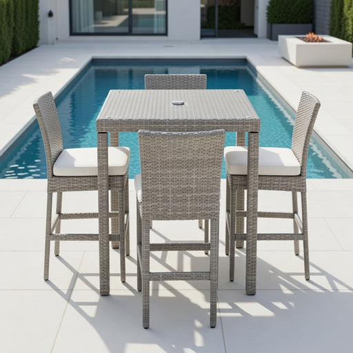 Description: Our Bar Set is designed for ultra-comfortable outdoor dining. Woven dove fibres are smoothly wrapped twice over the tabletop and down ...