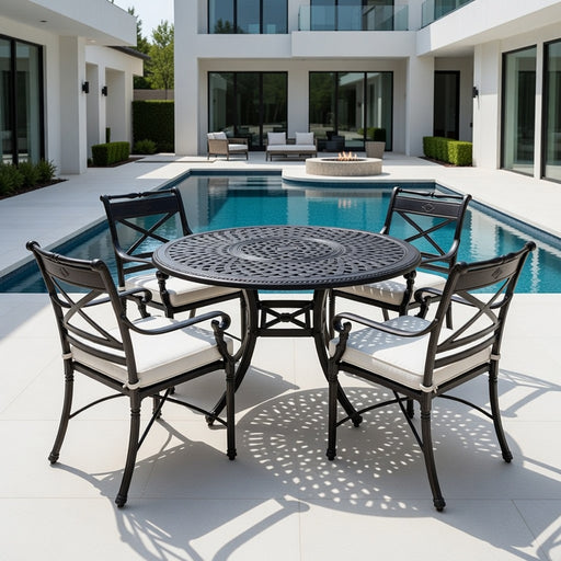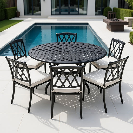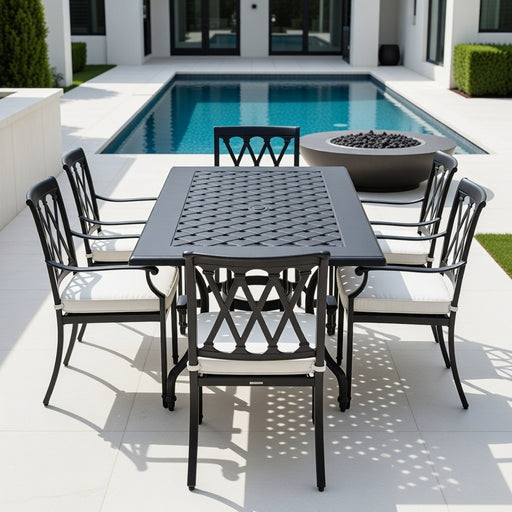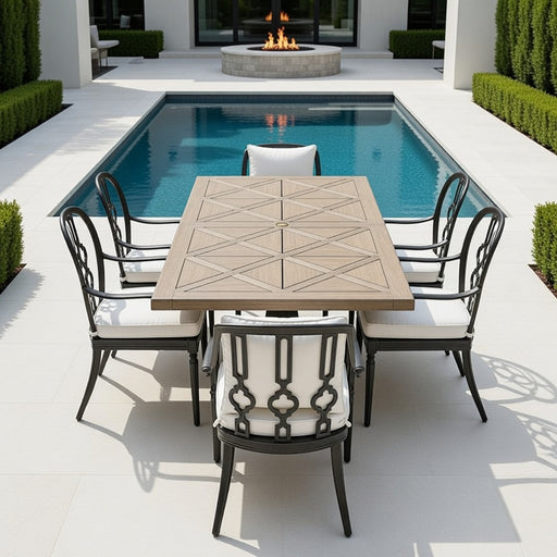 Description: With its classic curves and timeless design, this striking, comfortable and durable outdoor dining set invites you to enjoy meals with...