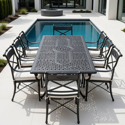 Description: Our 11-piece Estate Expandable Dining Set presents an oversized extended dining table and 10 chairs, creating a complete outdoor dinin...