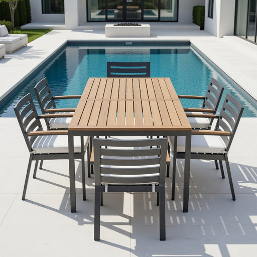 View full detailsExtendable Teak Dining Set in Bronze Finish and Cushions