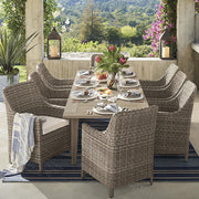With its classic curves and timeless design, this striking, comfortable and durable outdoor dining set invites you to enjoy meals with family and friends. All-weather wicker has a multidimensional look and is handwoven over a powder coated aluminum frame. Optional cushions are upholstered in 100% solution-dyed acrylic fabric. Expandable teak dining table can set up to 10 guests with ease.