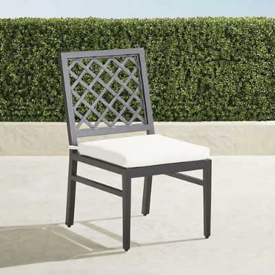 Simple and understated lines form a charming lattice pattern that makes our Bowery Dining Set a sophisticated and comfortable addition to any patio. The chairs have aluminum frames and a durable powder coated finish that protects against the elements. Included cushions are upholstered in 100% solution-dyed acrylic fabric. The dining table has a handcrafted high-quality, kiln-dried teak top on a durable powder coated aluminum base and expands from round to oval to accommodate additional people.