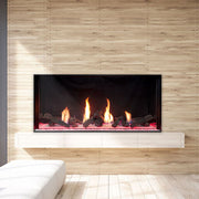 Plazas grand 55 inch wide by 24 inch tall viewing area will be the focal point of your home for years to come. Its barrier glass design replaces traditional barrier screens with an additional piece of glass creating a clean edge to edge viewing area. You can easily set your desired flame height and LED under-lighting with the simple to use remote controls. Finish your fireplace with a variety of log and media options that are sure to accentuate any décor. Plaza fireplaces are engineered with unlimited design and installation capabilities for every room. With the innovative heat redistribution system finishing materials can be brought up to the fireplace opening. This also allows for a TV artwork or mantel to be safely installed above the fireplace. Unobstructed views above the fireplace are made possible by its unique venting configuration. The Plaza also utilizes power vent technology which means greater vent run lengths and the ability to vent down below the fireplace.