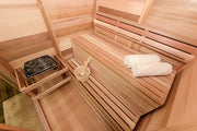 For added versatility, you can upgrade with optional semi-privacy panels, which retain the double-pane glass but include an exterior cedar grill for a more secluded feel. Compact yet spacious, this sauna is ideal for couples or small families seeking comfort, wellness, and relaxation year-round.