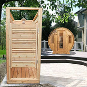 The Cloudburst Outdoor Shower features a modern privacy wall design with a self closing door mounted with stainless steel hinges. Enjoy this free standing outdoor shower at your cottage or in your backyard to cool down after a sauna session, swim in the lake or pool or to rinse down after relaxing in your hot tub. Handcrafted with western red cedar and shipped in an easy to assemble kit the Cloudburst Outdoor Shower is a popular design.