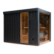 With its spacious, insulated interior (floor, walls, and roof), this modular sauna kit can be assembled with ease in virtually any setting. The combination of sleek black metal siding, weather-resistant EPDM roofing, and the warm elegance of Western Canadian cedar creates a striking yet timeless design that enhances any outdoor space.