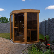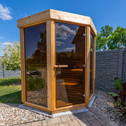 Introducing the Trinity Sauna โ a luxurious retreat crafted from premium Western Canadian clear or knotty red cedar, enhanced with sleek wrap-around bronze glass for a perfect blend of elegance and functionality. Designed as a 5-sided corner model, itโs ideal for small decks, patios, condos, or cottages, while offering the full spa experience in the comfort of your home.