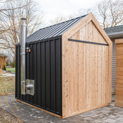 The Pure Cube Hudson Sauna blends a modern, sleek exterior with the timeless beauty of natural cedar. Featuring a black metal exterior siding and a Western Red Cedar interior, this sauna combines durability with warmth and comfort. Its striking tempered glass front wall and door create an open, inviting atmosphere, while the wide two-level benches allow you to fully embrace the heat and relax in style.