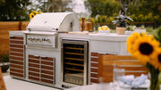 The 30-inch Alturi also features a unique Flame Thrower Ignition that shoots a burst of flame to ignite the main burners and is much more reliable than traditional spark ignition systems. The double lined, spring assisted hood keeps hot air in to ensure a consistent grilling environment complete with a built in 3-inch temperature gauge and interior halogen lighting with LED front panel lighting. In addition, the 11,000 BTU infrared back burner offers a high quality rotisserie burner for professional style rotisserie cooking and includes a storage bracket for the rotisserie spit when not in use. Available for both propane and natural gas, this built in grill ensures a complete outdoor kitchen.