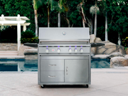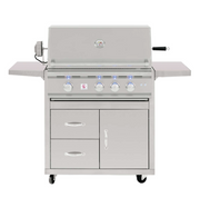 The 32-inch TRL offers a signature Flame Thrower Ignition that uses a burst of flame to ignite the main burners more reliably than a traditional spark system. The hood is fitted with a temperature gauge for easy monitoring and is built in a two-layer, insulated style to keep heat where it belongs, giving you a consistent cooking environment. Interior lights and LED enhancements offer exceptional ease of use in low-light conditions. As an added perk, it features a 15,000 BTU infrared back burner for professional-quality rotisserie cooking. The ready-to-assemble stainless steel grill cart offers dual drawers, a storage door, fixed shelves, and high quality locking casters to provide a terrific standalone grill option.