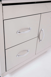 • Freestanding Grill Cart - Stainless steel grill cart features dual drawers, storage door, fixed side shelves, and locking casters