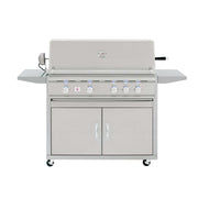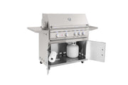 The 38-inch TRL offers a signature Flame Thrower Ignition that uses a burst of flame to ignite the main burners more reliably than a traditional spark system. The hood is fitted with a temperature gauge for easy monitoring and is built in a two-layer, insulated style to keep heat where it belongs, giving you a consistent cooking environment. Interior lights and LED enhancements offer exceptional ease of use in low-light conditions. As an added perk, it features a 15,000 BTU infrared back burner for professional-quality rotisserie cooking. The ready-to-assemble stainless steel grill cart offers dual drawers, a storage door, fixed shelves, and high quality locking casters to provide a terrific standalone grill option.